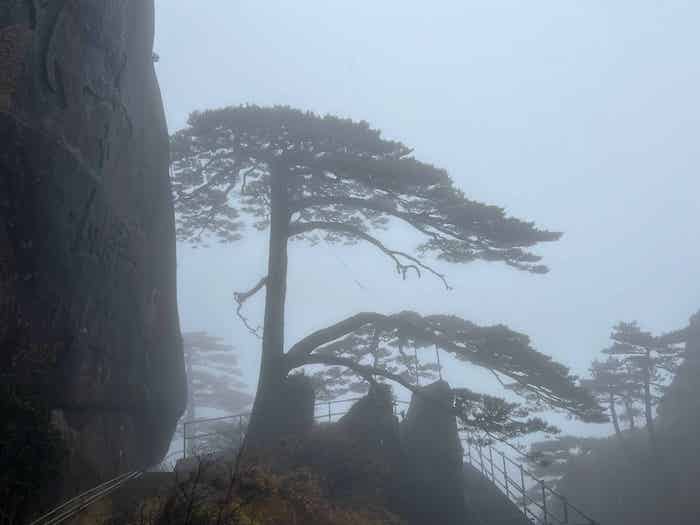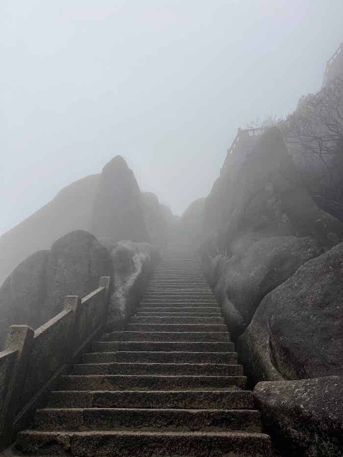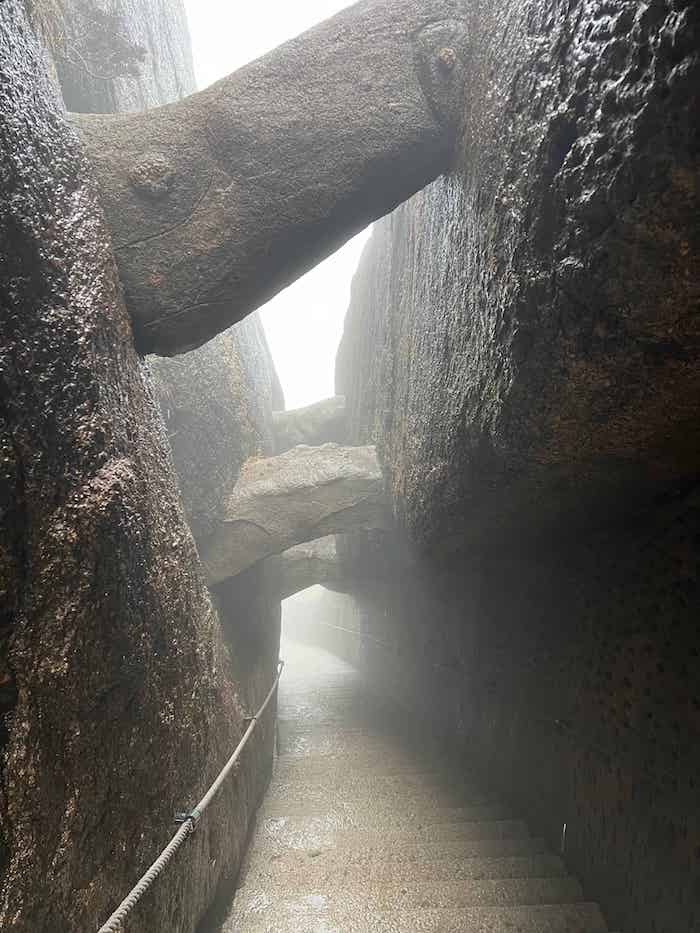 黄山的攻略,大多花在了天气上。民间常说黄山“雨后必有云海,寒潮必有雾凇”。我们选择在阴雨浓雾天气上山,爬山过程只知道身处黄山中,却完全看不到其他景色。好在体感舒服,爬起来并不算累。当晚入住白云宾馆,晚上的自助餐虽味道一般,但品类齐全而且管饱。饭后在房间泡上一大壶猴魁茶,味道一般,但意境拉满。原计划第二天在光明顶看日出,但天气预报显示依然下雨浓雾。我决定“赌”一把,选择在山上的狮林宾馆再加住一晚。推荐下神奇的闲鱼,订酒店比网上要便宜几百还多了双人晚餐自助。