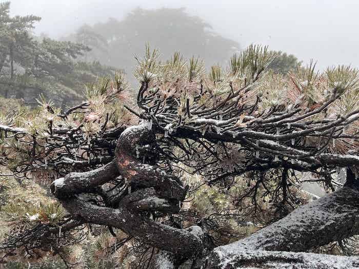 第三天,所有的等待终于迎来了回报。日出时间 6:54,我们 6:05 便摸黑出门,步行十分钟到达始信峰。这时人还不算多,我们机智地站在了一个主播的边上,事实证明这是绝佳的观景位。运气在这一刻爆棚,云海、日出、雾凇、雪景同时在眼前铺开,有一眼万年的感觉,一切都变的很值得。后来听说下山晚的话索道会排队 3 小时,我们看完日出便回酒店吃早餐,然后开始下山,下山途中,那些上山时错过的风景也悉数“补票”。步行两小时到达玉屏索道,中午的索道一点儿都不用排队,双人独享缆车。