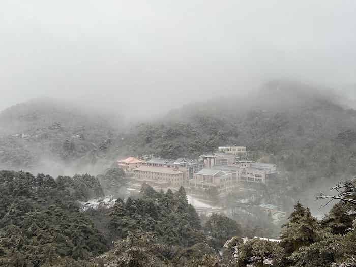 第二天不到六点闹钟响了后,打开抖音看到狮林宾馆的人在直播,从他白茫茫的镜头和话述中放弃了起床,继续睡到自然醒。吃完早饭退房后徒步不到一小时抵达狮林宾馆,入住后休息了会儿,外面已经下雪。我们出门转了转,能见度很低,在狮子峰看不到那只观海的猴子。回到狮林宾馆后,去吃自助晚餐,相比白云宾馆味道要好一些,饭后我自己出去走了走,看看雪景,山上很安静,想到那句歌词:“烟一支一支的点,酒一杯一杯的干”。。。