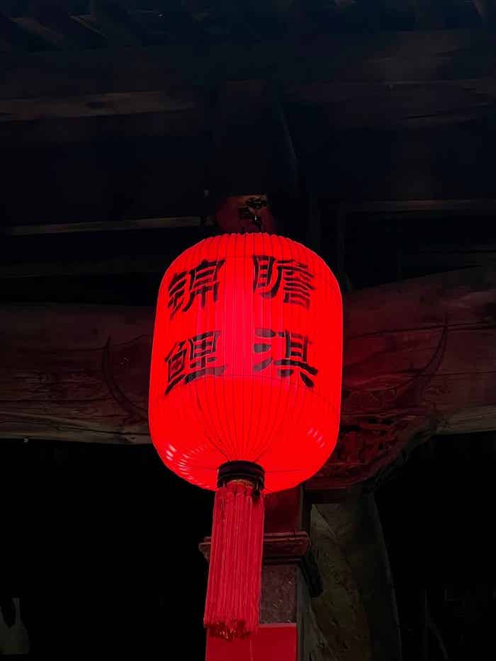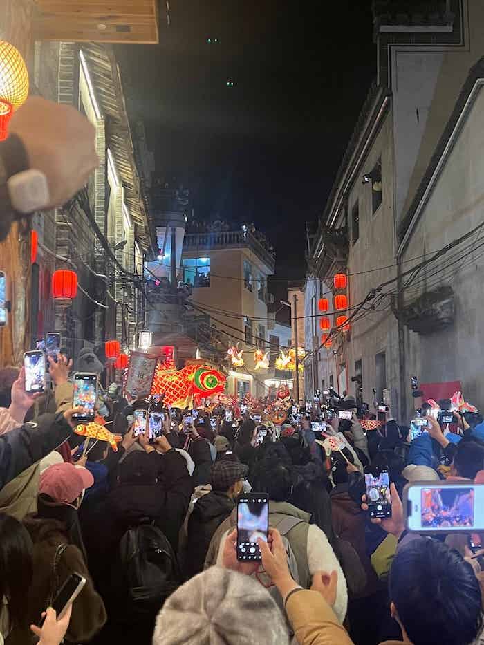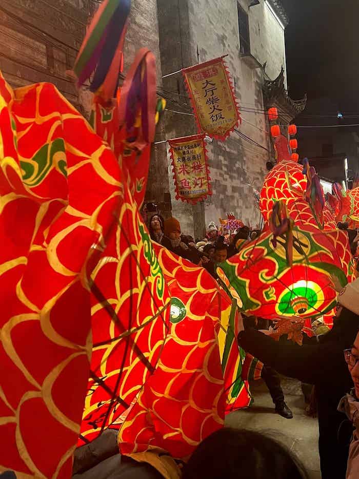 吃完便打车前往几公里外的瞻淇村看传承了800多年的鱼灯。这里是此行除黄山外,我最期待的一站。我们先在村中闲逛溜达,然后提前在鱼灯巡游最佳位置等待,大概 18:10 就传来锣鼓声;18:30 随着鼓点骤响,巨大的“头鱼”准时从“敦睦堂”游出,那一刻全场沸腾。白天还在村口卖烤肠、炸串的小伙子们,此刻已化身为手持巨型纸糊鱼灯的舞者,在狭窄的民居巷弄里穿街过巷。虽然早有心理准备,知道这里的鱼灯很棒,但当大鱼贴身游过时,还是激动得数次说不出话,此刻热闹得如同过年,所有人都能近距离触碰那份传承,摸摸鱼头,万事不愁、摸摸鱼身,幸福一生、摸摸鱼尾,顺风顺水。。。