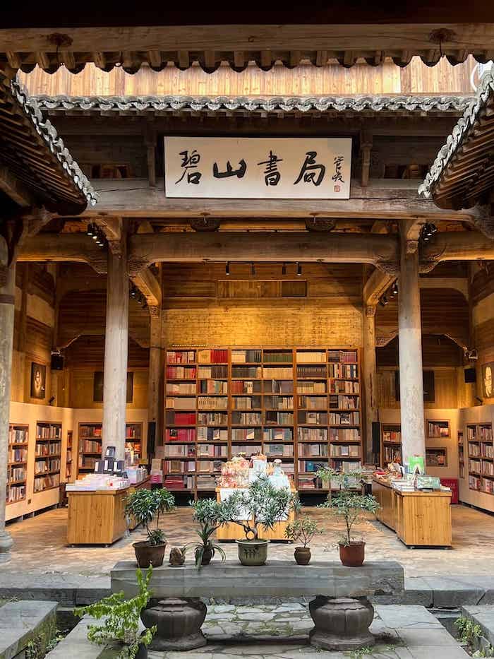 第一站选择南屏村,这里是电影《菊豆》的主要取景地。村子很幽静,只在叶氏祠堂附近见到了游客。我们在村里闲逛许久,一只不知谁家的“导游小狗”,伴着我们穿过了一条又一条小巷。它始终走在前方带路;当发现我们没跟上,还会折返回来,如此反复。在南屏闲逛很久后我们打车前往碧山村。这里将古老的祠堂改造成了碧山书局,被誉为“中国最美书店”,确实很美。但是若将这两个村子整体对比,我还是更喜欢南屏的幽静。