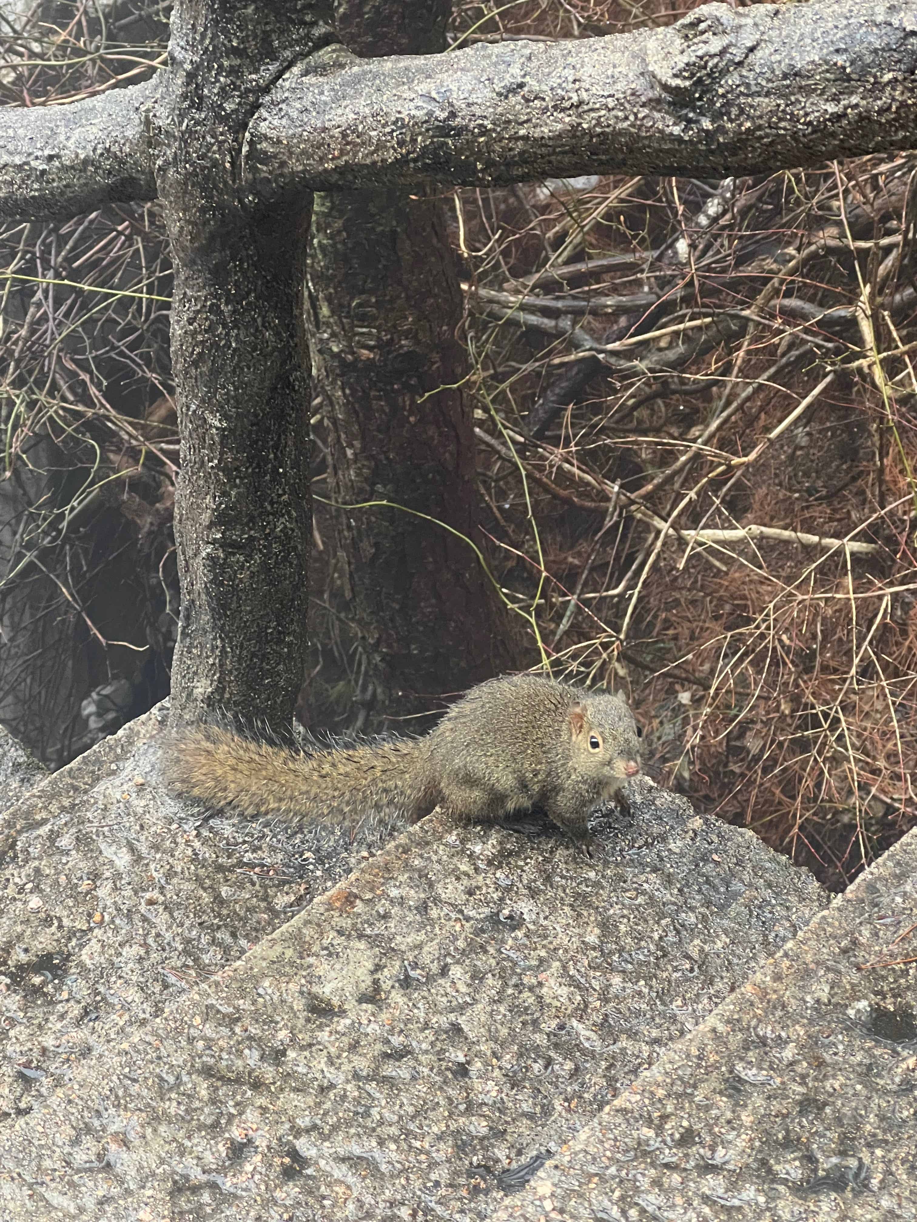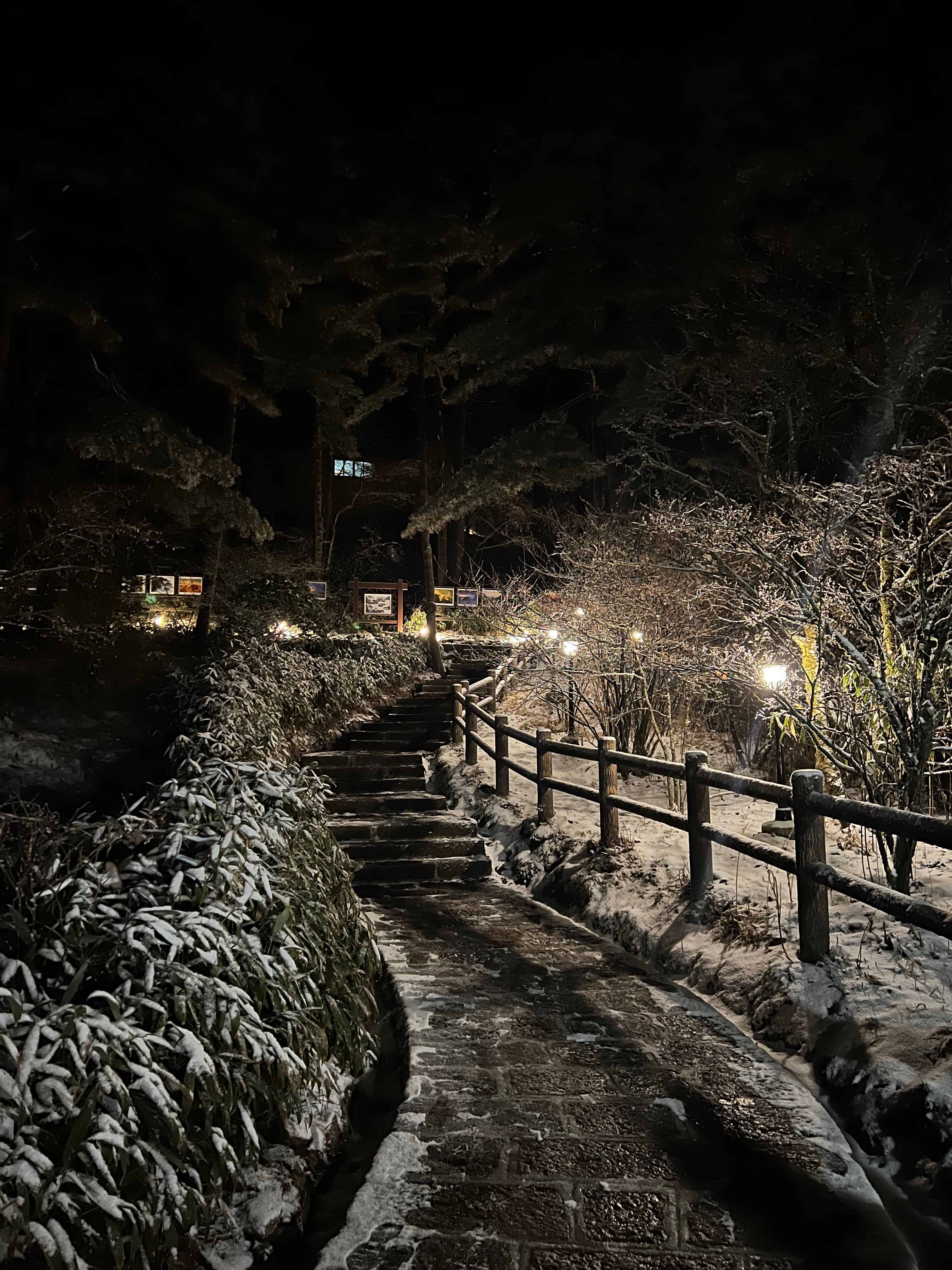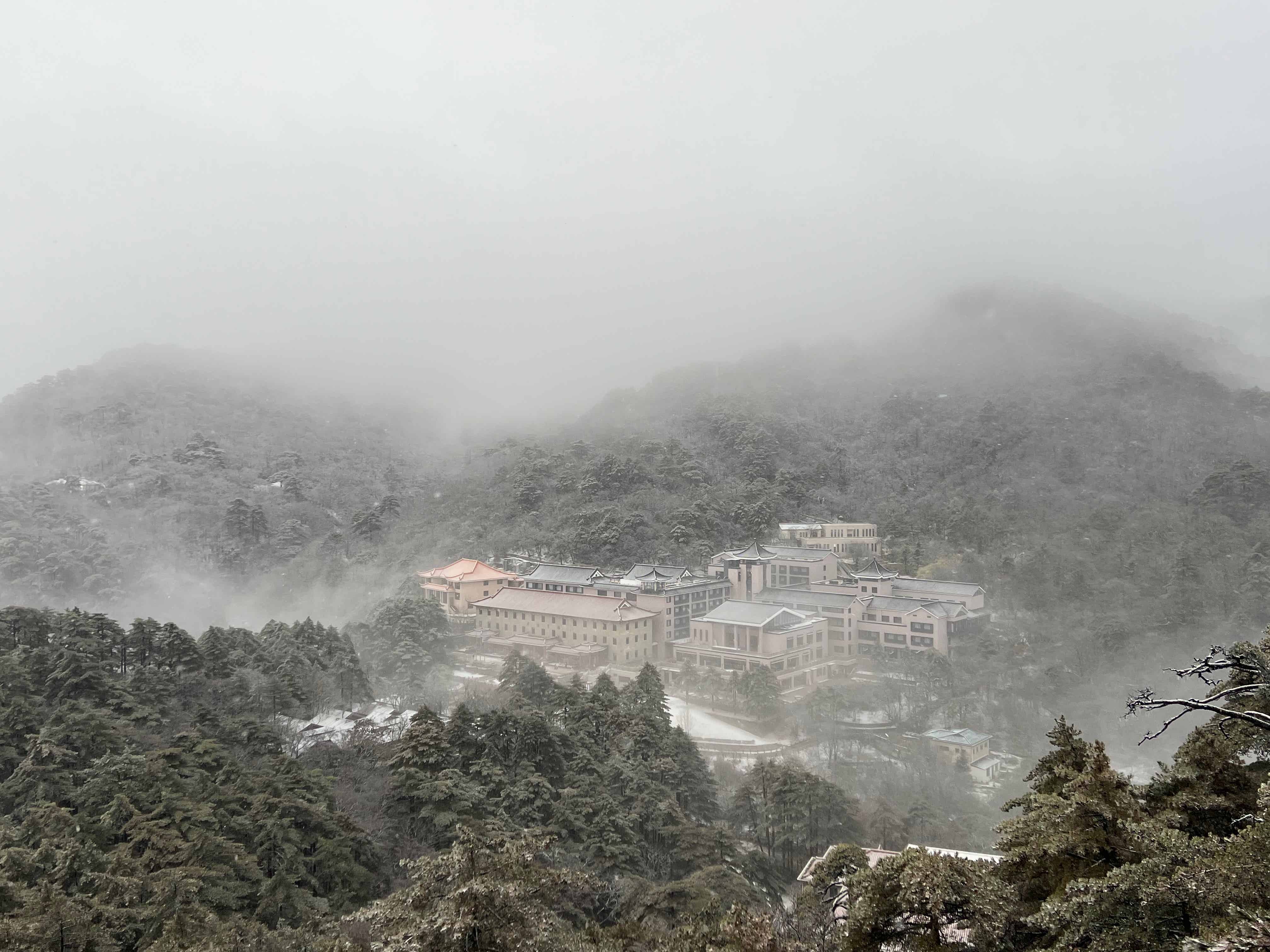第二天不到六点闹钟响了后,打开抖音看到狮林宾馆的人在直播,从他白茫茫的镜头和话述中放弃了起床,继续睡到自然醒。吃完早饭退房后徒步不到一小时抵达狮林宾馆,入住后休息了会儿,外面已经下雪。我们出门转了转,能见度很低,在狮子峰看不到那只观海的猴子。回到狮林宾馆后,去吃自助晚餐,相比白云宾馆味道要好一些,饭后我自己出去走了走,看看雪景,山上很安静,想到那句歌词:“烟一支一支的点,酒一杯一杯的干”。。。