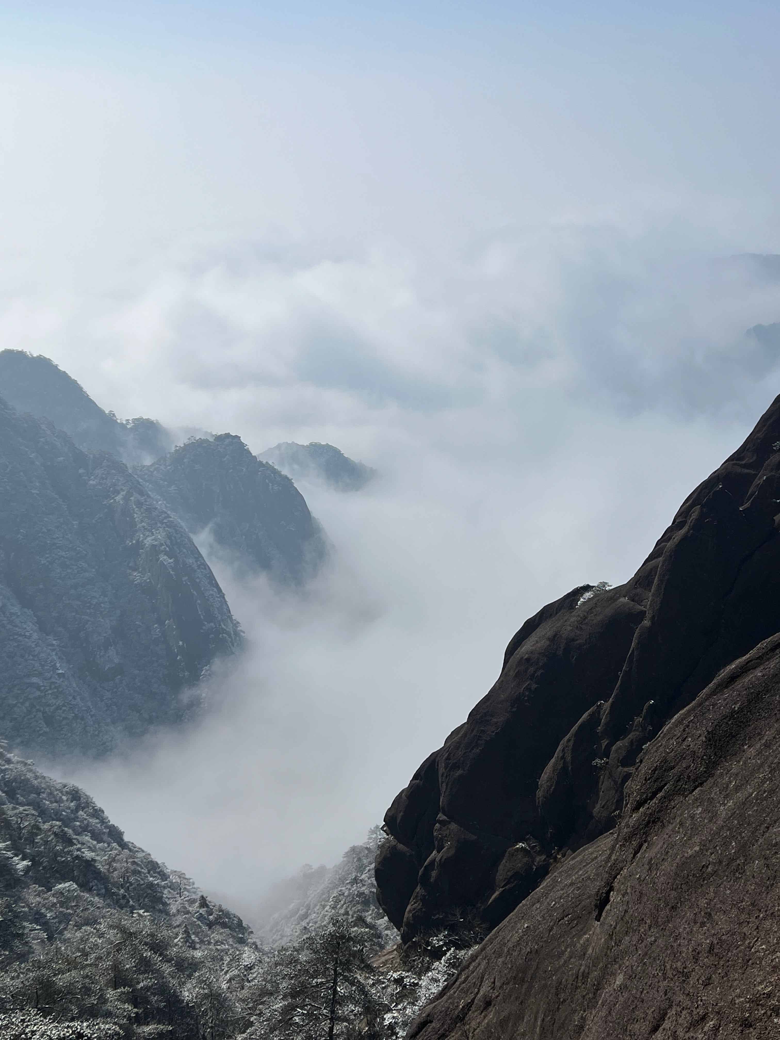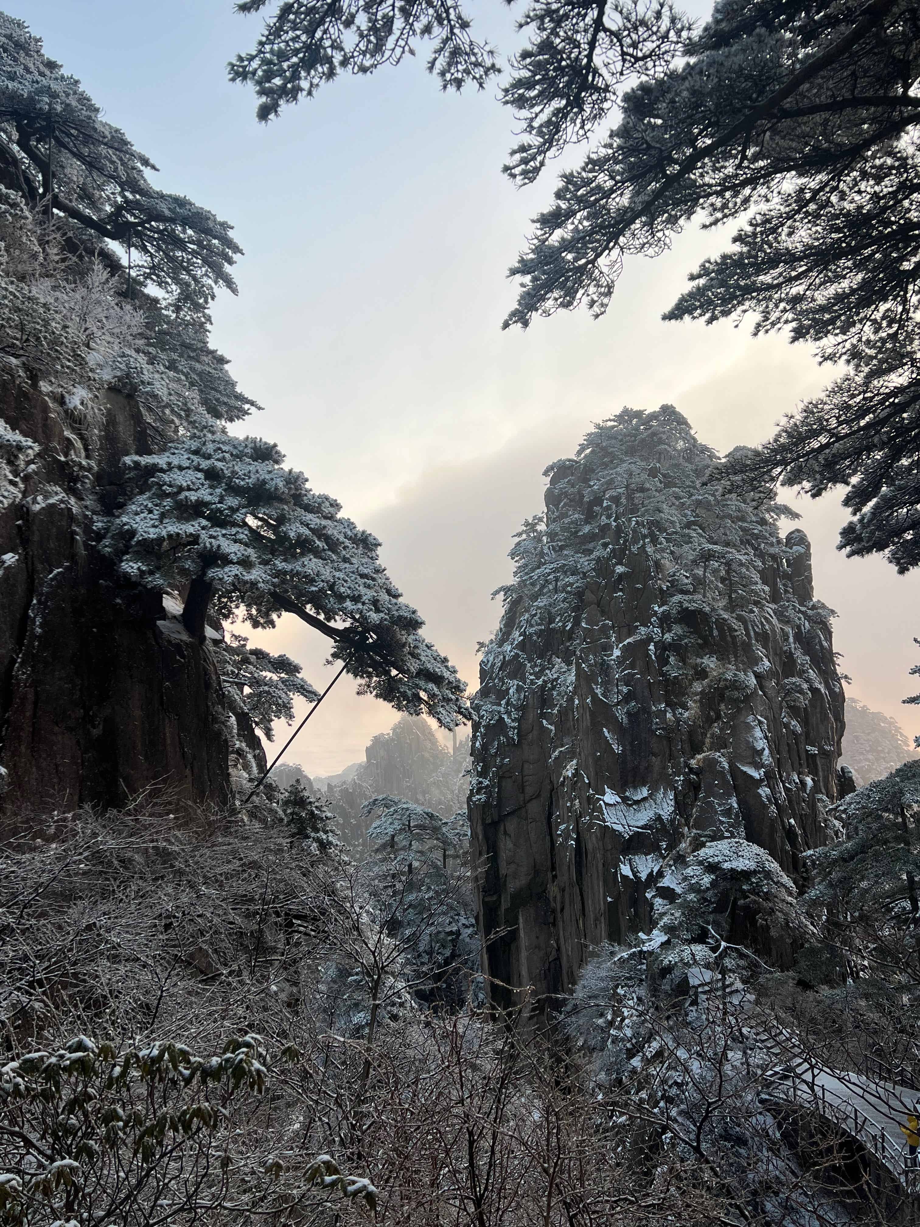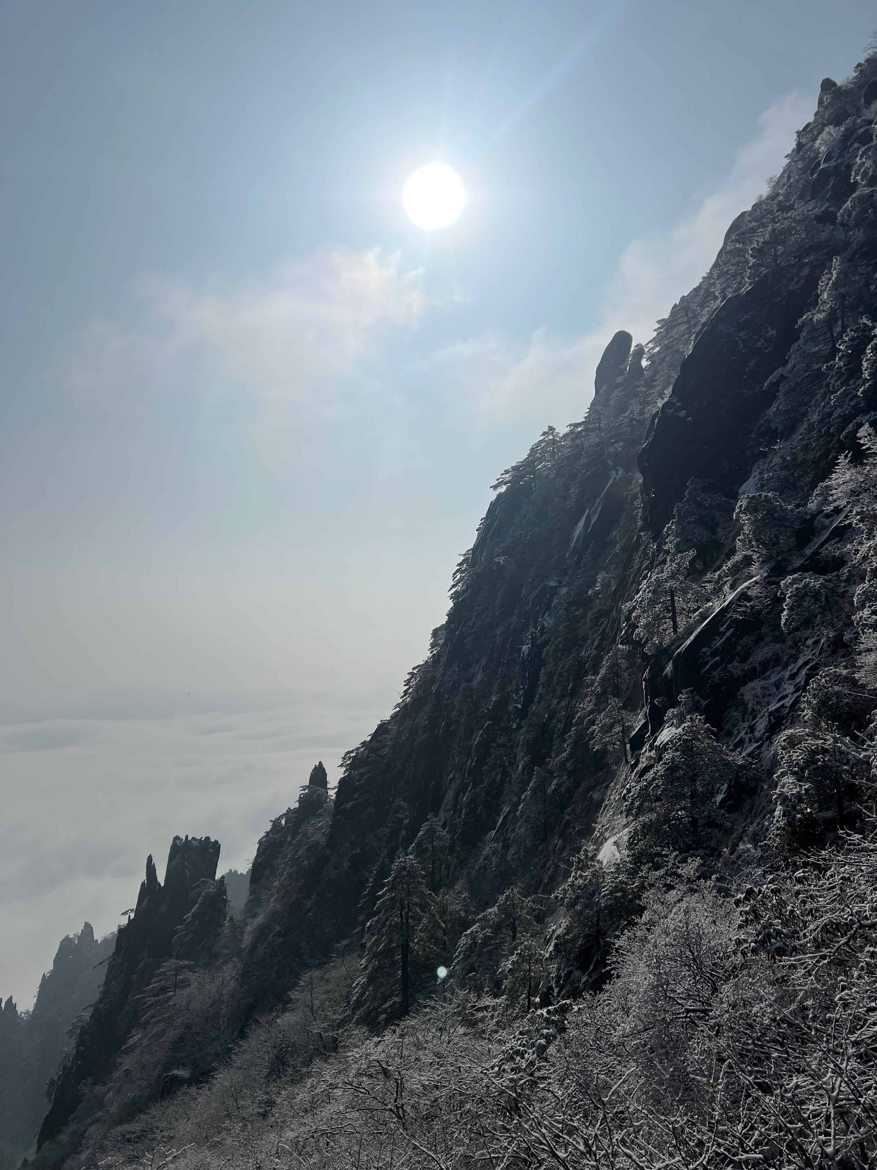 第三天,所有的等待终于迎来了回报。日出时间 6:54,我们 6:05 便摸黑出门,步行十分钟到达始信峰。这时人还不算多,我们机智地站在了一个主播的边上,事实证明这是绝佳的观景位。运气在这一刻爆棚,云海、日出、雾凇、雪景同时在眼前铺开,有一眼万年的感觉,一切都变的很值得。后来听说下山晚的话索道会排队 3 小时,我们看完日出便回酒店吃早餐,然后开始下山,下山途中,那些上山时错过的风景也悉数“补票”。步行两小时到达玉屏索道,中午的索道一点儿都不用排队,双人独享缆车。