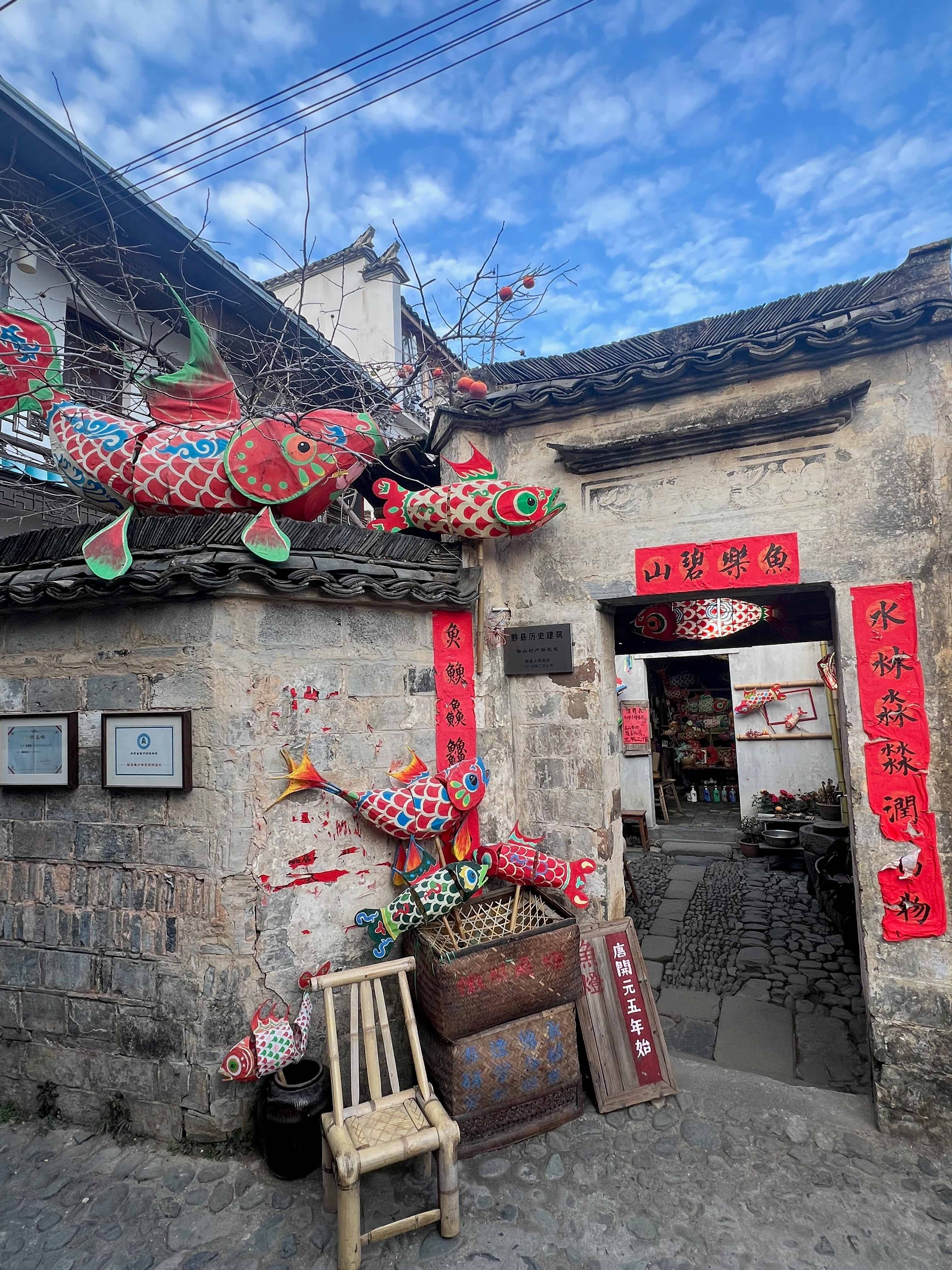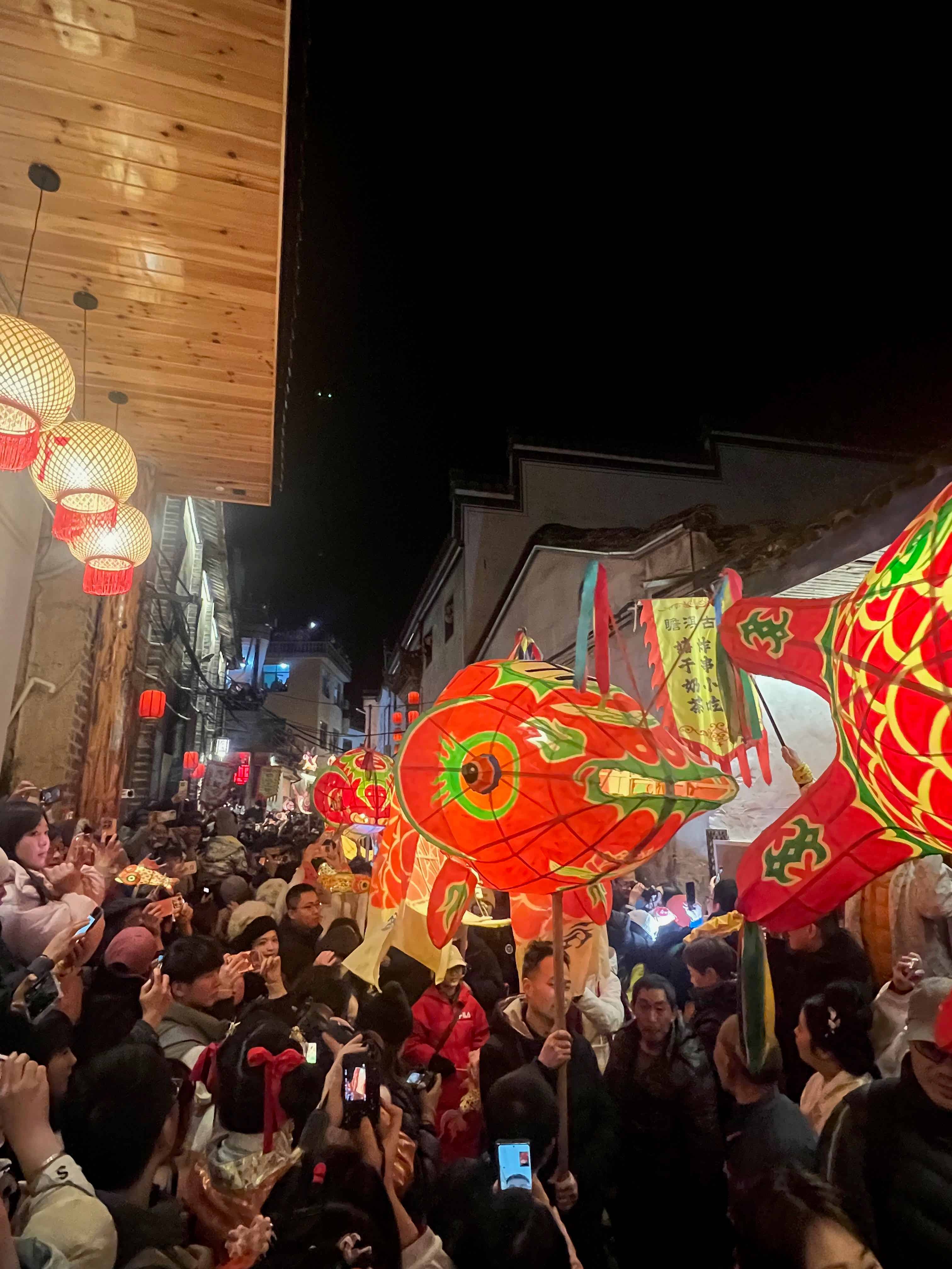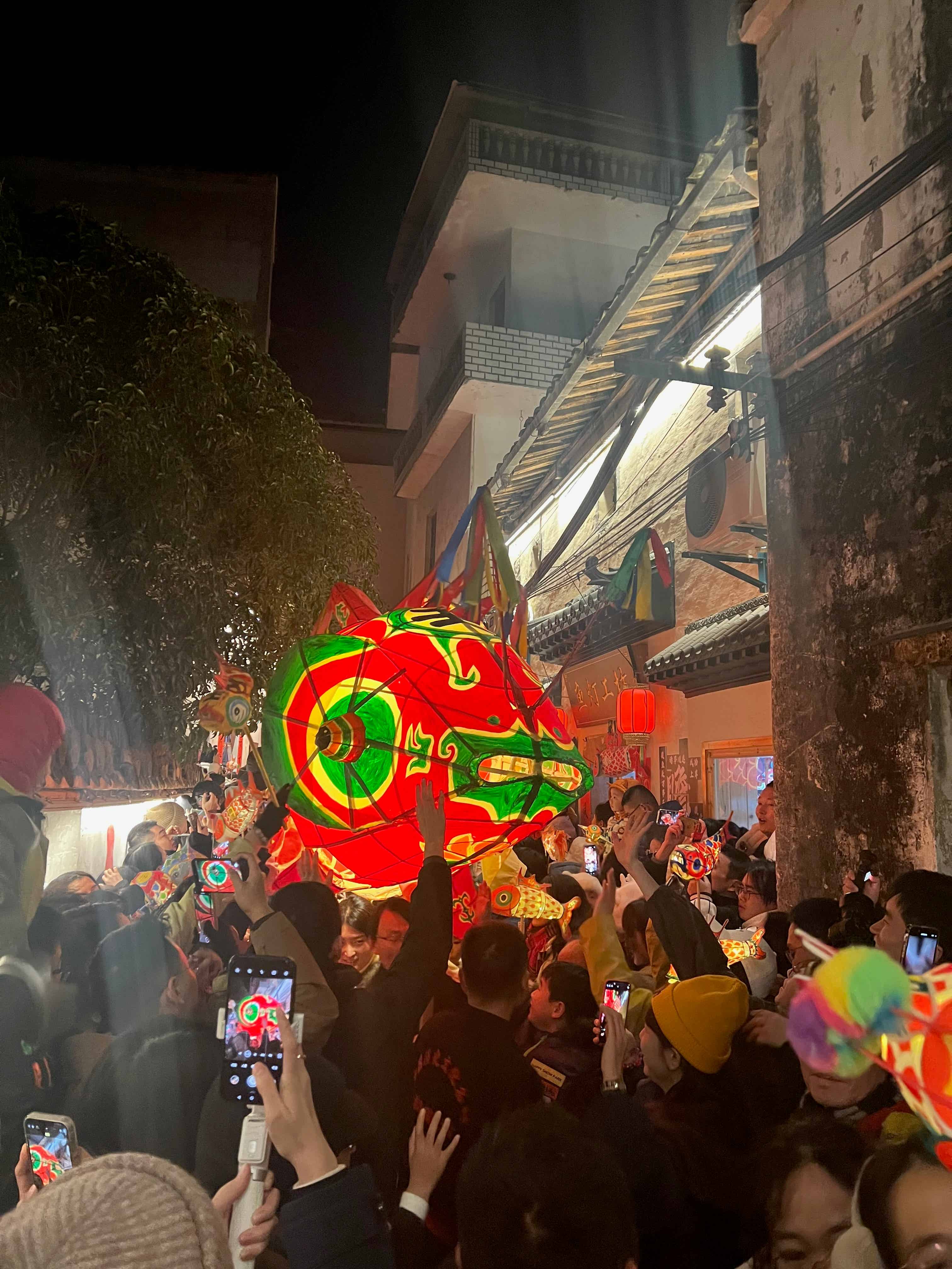 吃完便打车前往几公里外的瞻淇村看传承了800多年的鱼灯。这里是此行除黄山外,我最期待的一站。我们先在村中闲逛溜达,然后提前在鱼灯巡游最佳位置等待,大概 18:10 就传来锣鼓声;18:30 随着鼓点骤响,巨大的“头鱼”准时从“敦睦堂”游出,那一刻全场沸腾。白天还在村口卖烤肠、炸串的小伙子们,此刻已化身为手持巨型纸糊鱼灯的舞者,在狭窄的民居巷弄里穿街过巷。虽然早有心理准备,知道这里的鱼灯很棒,但当大鱼贴身游过时,还是激动得数次说不出话,此刻热闹得如同过年,所有人都能近距离触碰那份传承,摸摸鱼头,万事不愁、摸摸鱼身,幸福一生、摸摸鱼尾,顺风顺水。。。