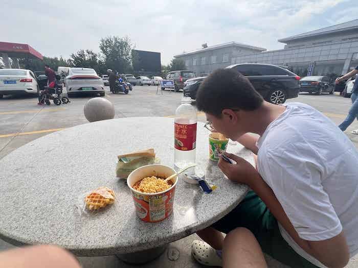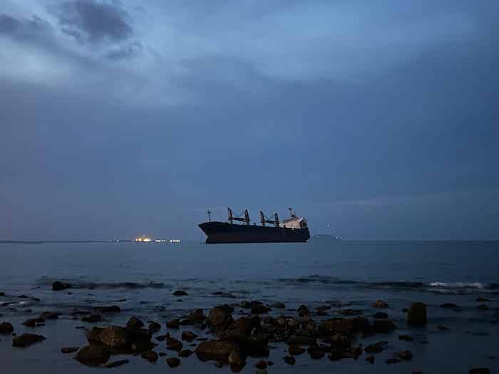 离开酒店后买了麦当劳和咖啡,边吃边开车上高速,孩子吃了两个汉堡、一个派和一些小食,胃口真好。大约 3 小时后到达距离搁浅巨轮 3 公里的地方,又在找停车场时堵了 1.5 小时。停好车后去海边玩到天黑,再沿“滨海公路”开车约 1.5 小时抵达威海入住。晚上在酒店附近吃烧烤,味道意外地好,他家的沂蒙炒鸡分量也超大,剩了不少。