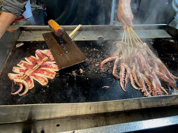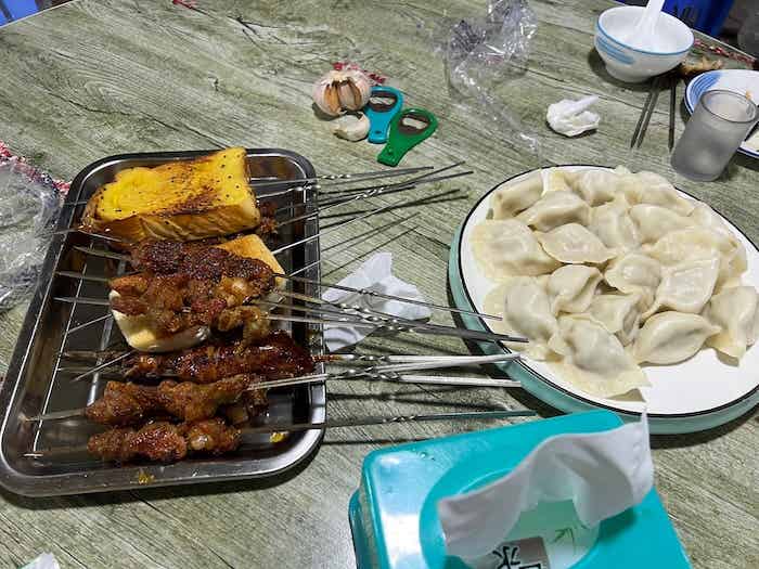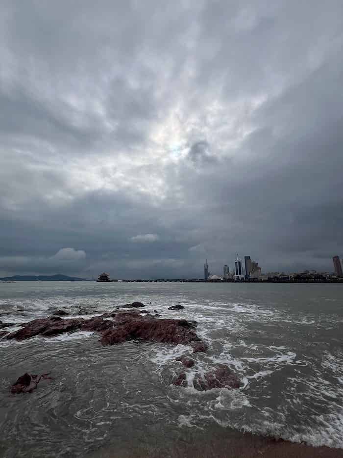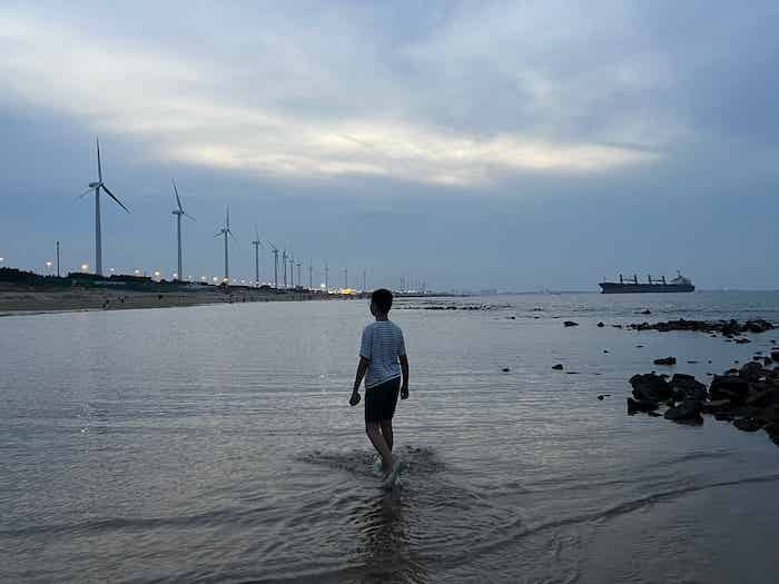 中午起床坐地铁去打卡“栈桥”,人很多,在海边玩了一会儿,结果孩子鞋湿透了,只好回台东换鞋。之后再坐地铁到鲁迅公园,天已经快黑了。刚进公园就看到满是礁石的海岸,沿着海边一路走到“第一海水浴场”和“八大关”。在街角吃了几串铁板鱿鱼,配上一瓶冰镇崂山可乐,味道超好。最后地铁回台东,吃蛤蜊、喝啤酒收尾。