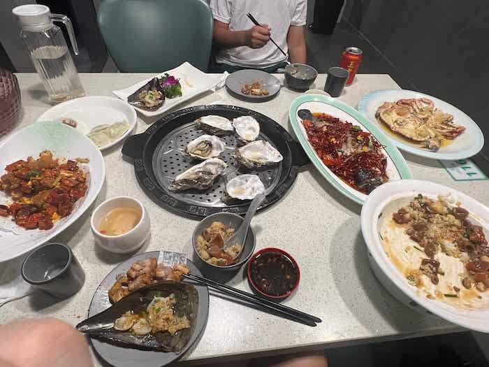 到酒店前发现房价从 400 多掉到 300 多,于是退掉重订!出来玩还是要选“可退房”,价格一天能变好几次。晚上去“巧克力渔家”吃饭,点了海肠捞饭、石斑鱼、鲅鱼水饺、螃蟹、生蚝、猪蹄,配半斤汾酒+一扎青岛鲜啤,喝多了,打车回酒店睡觉。
