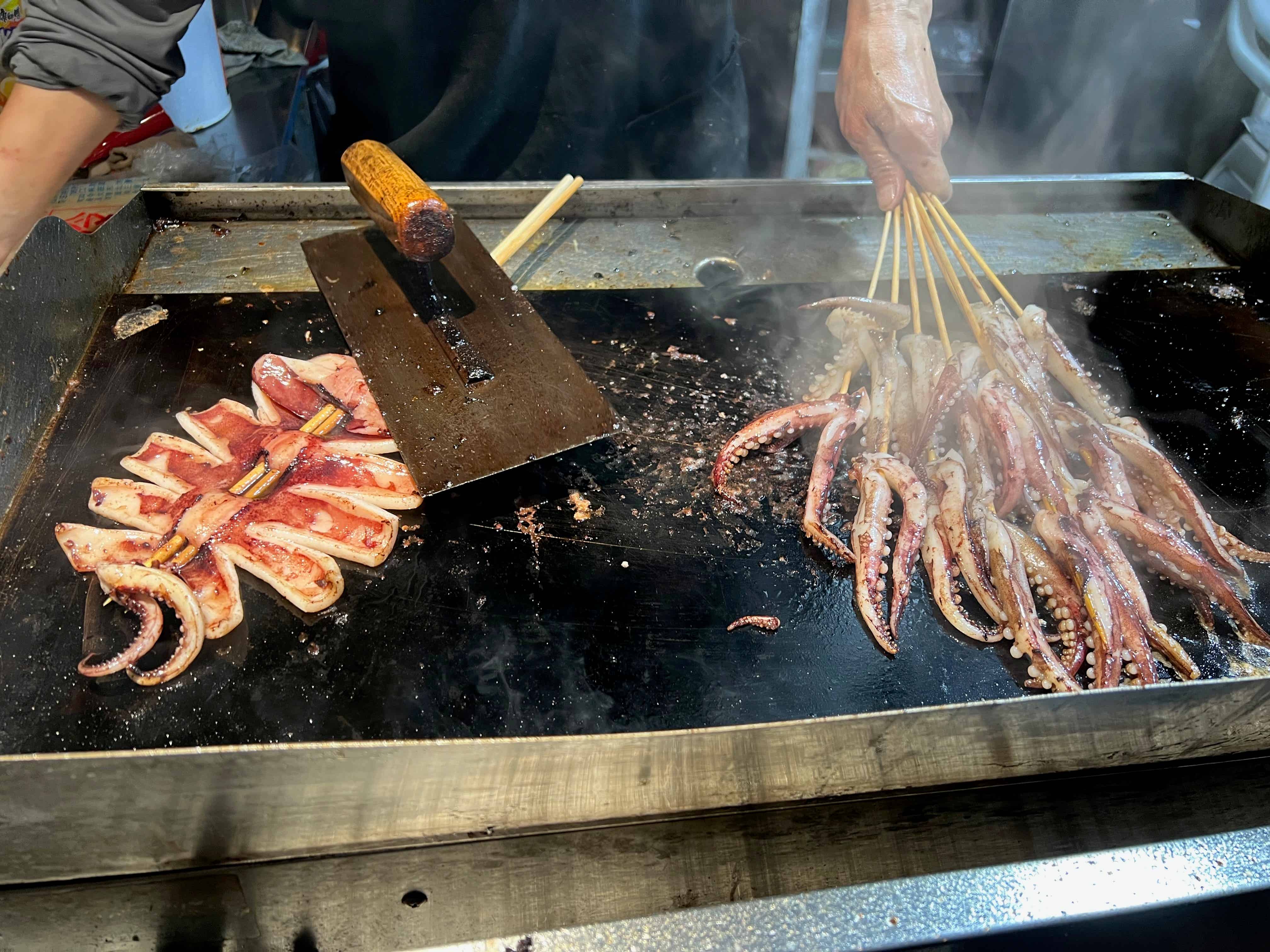 中午起床坐地铁去打卡“栈桥”,人很多,在海边玩了一会儿,结果孩子鞋湿透了,只好回台东换鞋。之后再坐地铁到鲁迅公园,天已经快黑了。刚进公园就看到满是礁石的海岸,沿着海边一路走到“第一海水浴场”和“八大关”。在街角吃了几串铁板鱿鱼,配上一瓶冰镇崂山可乐,味道超好。最后地铁回台东,吃蛤蜊、喝啤酒收尾。