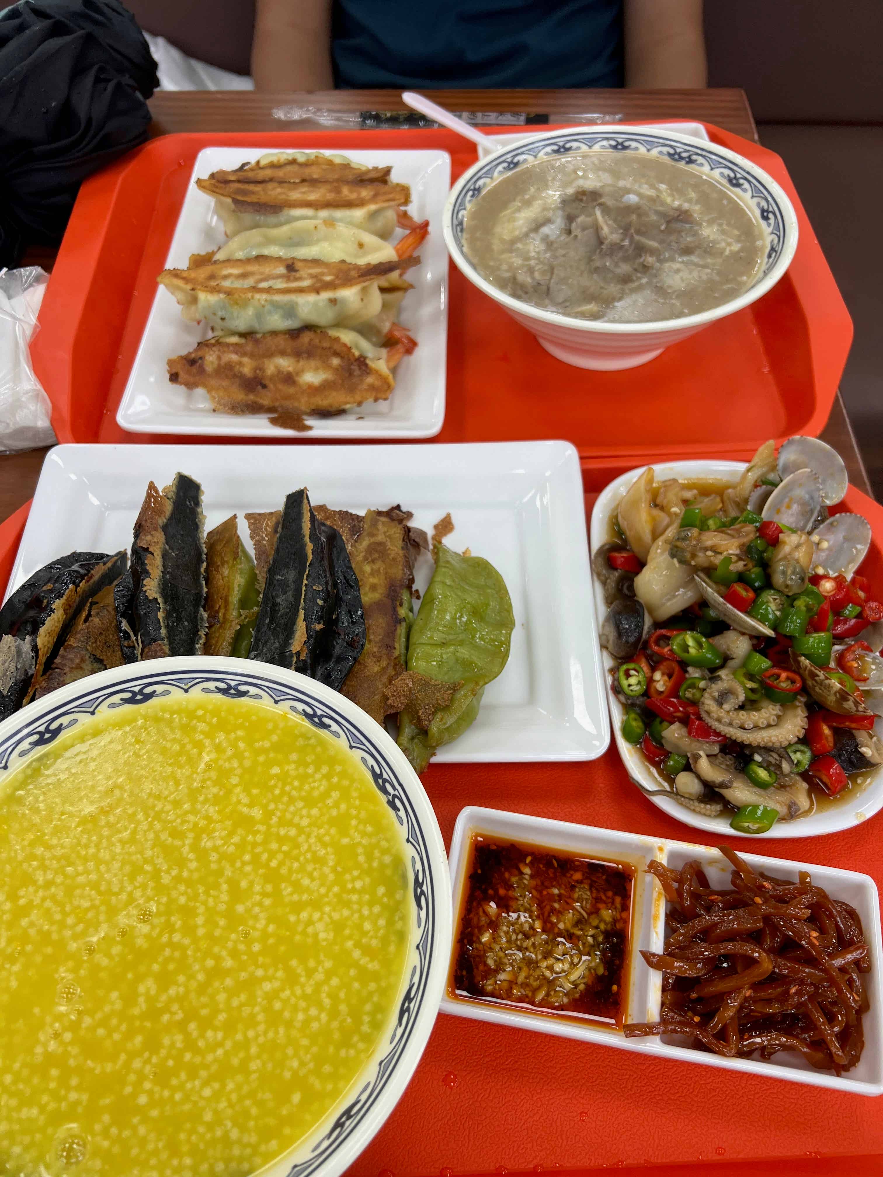 今天中秋,打算吃顿大餐,搜到“映像威海”,感觉是真正的当地人常去的店。店里没有菜单,照着食材点菜:大郎烧饼、葱花饼、水饺、红烧肉、温拌海螺、炒青菜,扇贝、海胆、生蚝各点一个,味道都不错,温拌海螺最好吃。吃完去金沙滩溜达,海边海鸥很多,人少景美,这里也是此行最喜欢的沙滩。后来又打卡“火炬八街”和“国际海水浴场”,人多景也一般。